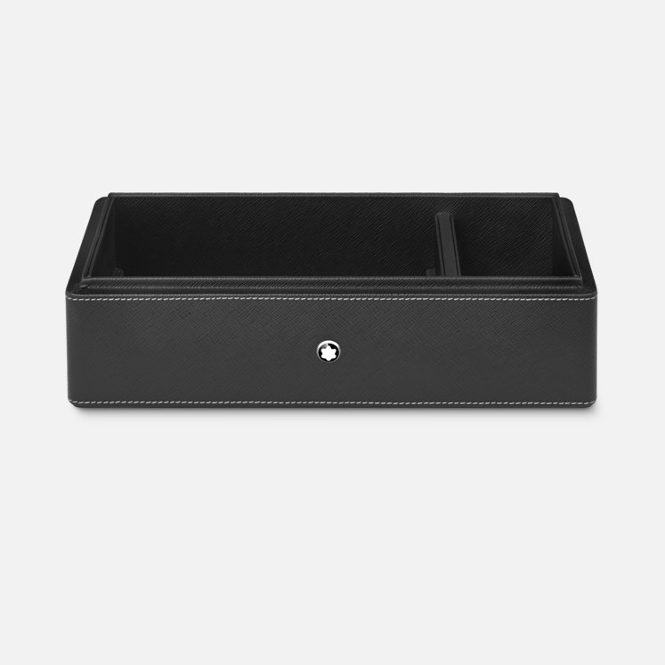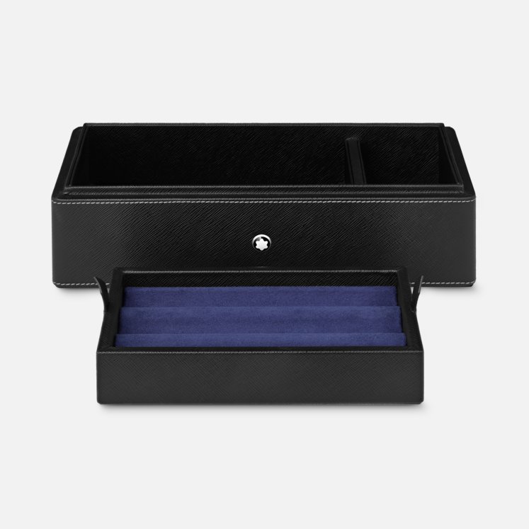 Descrizione : La scatola da scrivania Montblanc in pelle nera è l’accessorio perfetto per organizzare i tuoi strumenti di scrittura. Con spazio per 3 penne e una boccetta d’inchiostro, il suo coperchio funge da contenitore aggiuntivo. Elegante e funzionale, è ideale per il tuo studio o ufficio. Disponibile online o presso il negozio Montblanc a Roma, Via Giuseppe Taverna, 4.