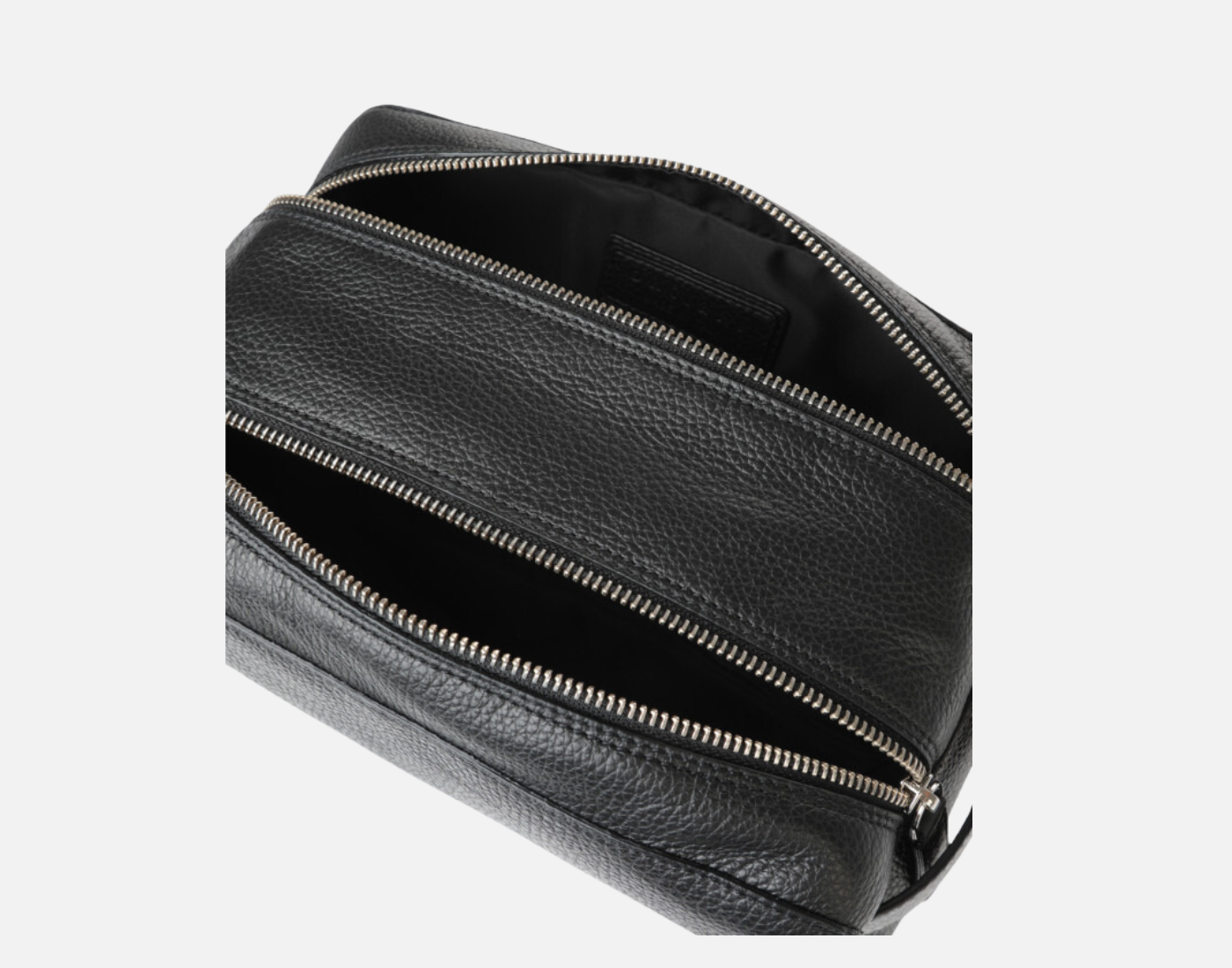 Campo 13: I due ampi compartimenti chiudibili separatamente con zip, permettono di organizzare gli accessori da toilette e il manico laterale consente di trasportarlo comodamente. La pelle martellata e la fodera interna in nylon rigenerato ECONYL® lo rendono morbido e adattabile.